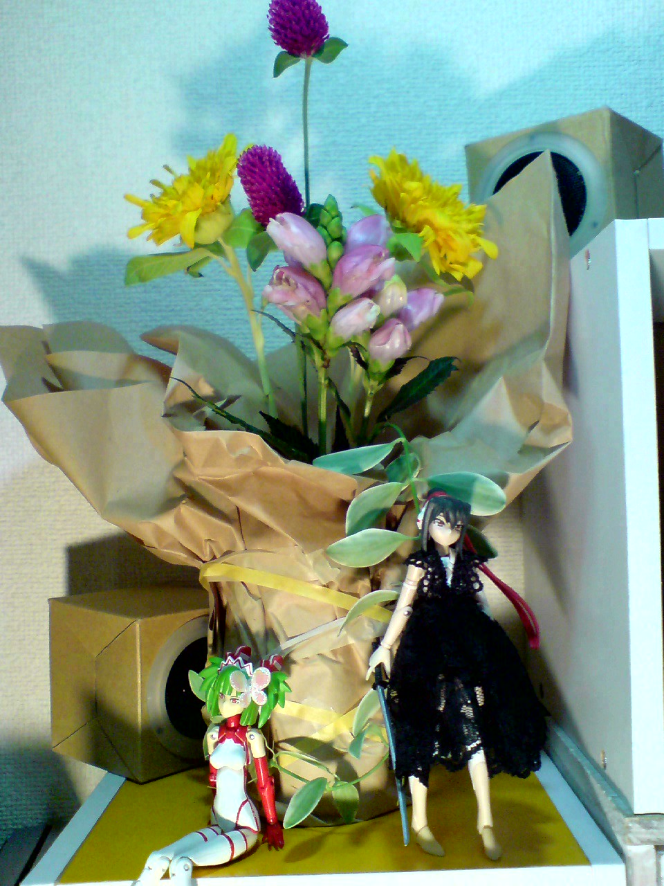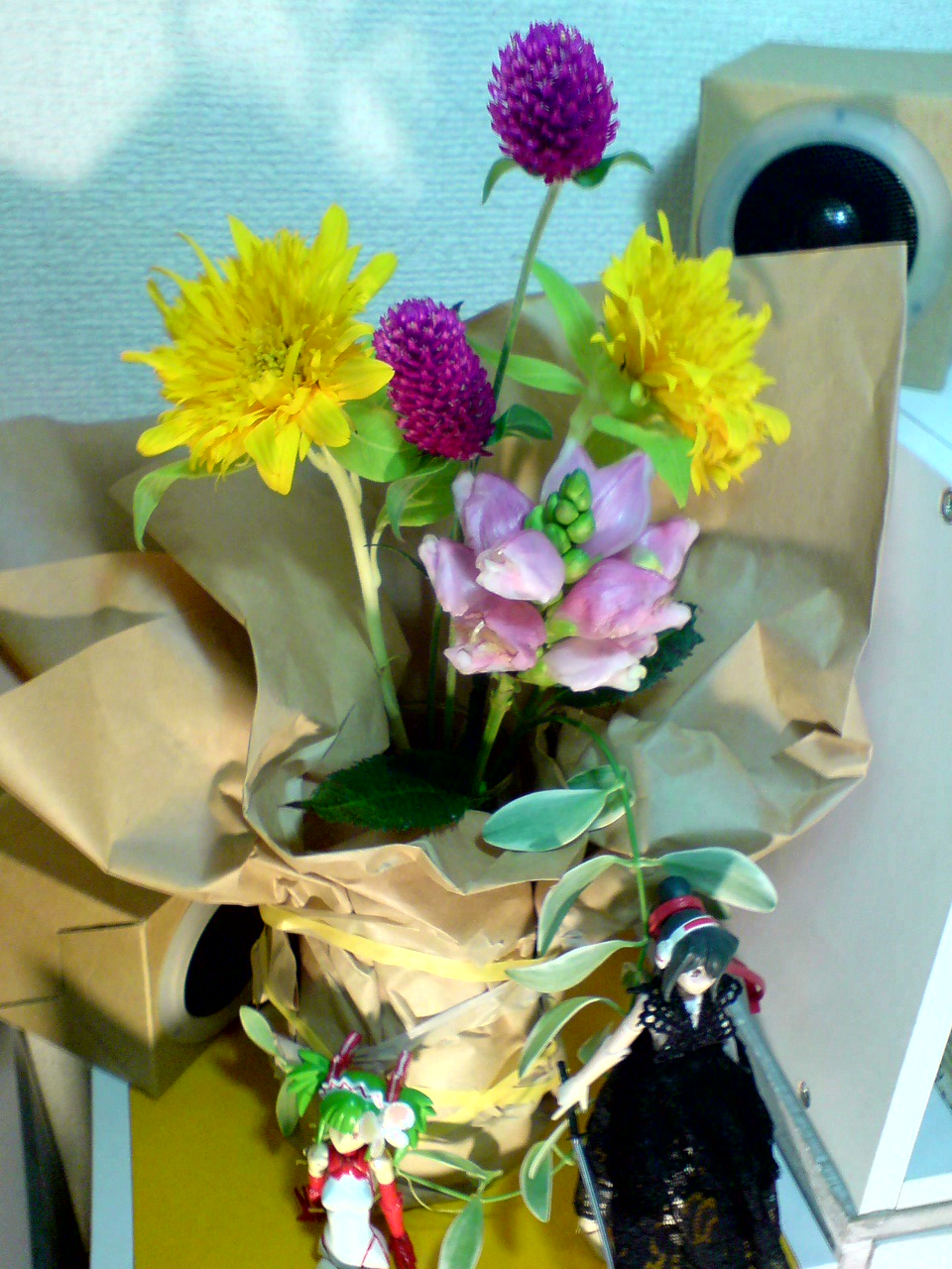 家にあったのが透明な花瓶だけで中が見えるのが気にくわなかったので包み紙とマスキングテープで即席ラッピング。今流行のオサレテープだけじゃなくて模型用も使ってるのがなんとも。